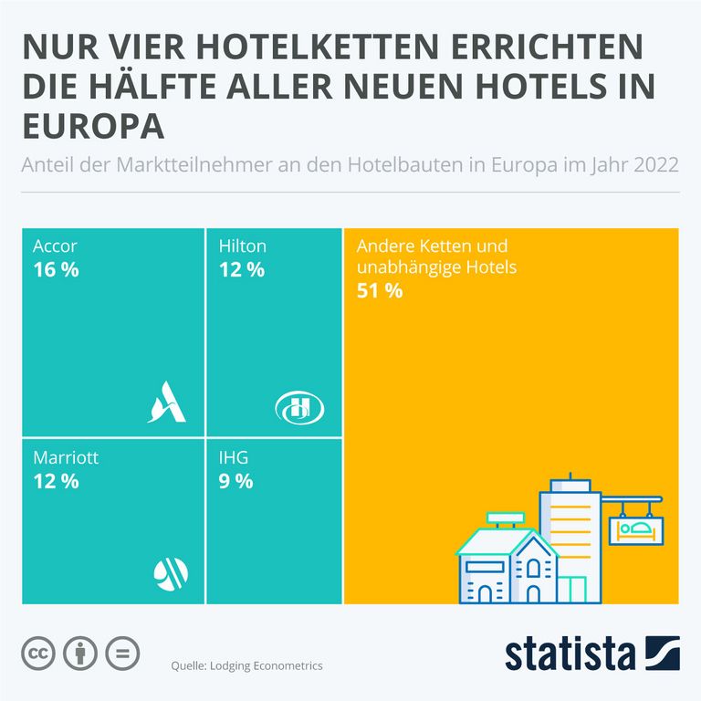 Große Hotelketten wie Accor und Hilton errichten den Großteil der neuen Hotels in Europa. Wie Statista mitteilte, steht das französische Unternehmen Accor hinter 16 Prozent der Hotelneubauten. Zwei amerikanische Hotelketten, Hilton und Marriott, bauen jeweils 12 Prozent der neuen Hotels auf dem Kontinent. Insgesamt fügen die Hotelketten schneller neue Häuser hinzu als die unabhängigen Hotels in Europa.