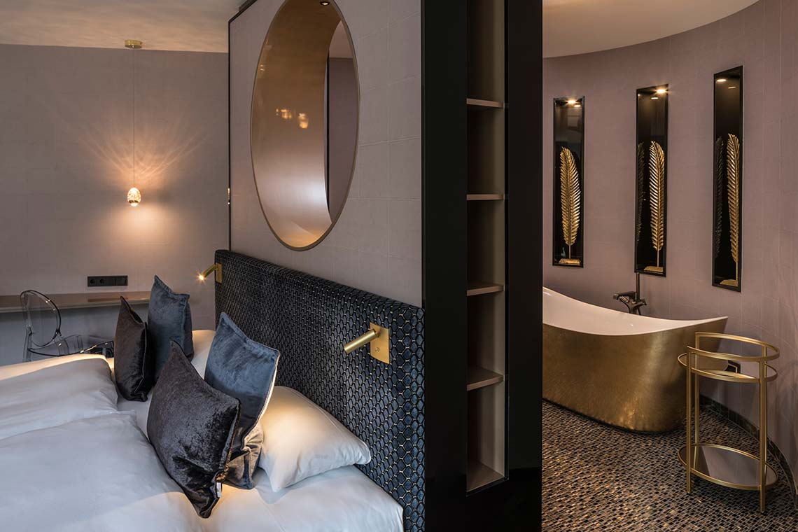 Das Anwesen von 70.000 Quadratmetern verfügt über mehrere Gebäude aus unterschiedlichen Jahrhunderten – ein weiterer hoher Anspruch war es daher, Farben, Materialien und Stile auszusuchen, die sich stimmig ins Gesamtbild einfügen. Der Trick bestand darin, die Locations, die einen trendigen Style bekommen sollten, vollständig zu sanieren, und die von vielen Gästen geschätzten historischen Bereiche im denkmalgeschützten Schwarzwaldhaus von 1639 zu belassen, wie sie waren. In Räumlichkeiten hingegen, die einfach nur etwas in die Jahre gekommen waren, wurde mit Wandfarben und wirkungsvollen Interieurelementen ein neues angenehmes Ambiente erreicht – etwa im Wellnesspavillon