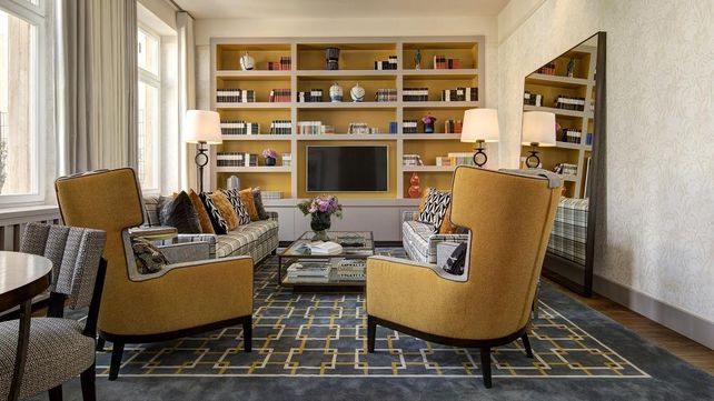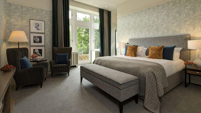 Jede der Signature Suiten verfügt über einen Eingangsbereich, der in einen Wohnbereich mit Holzböden aus dem Bayerischen Wald mündet. Ein Blickfang sind die vor Ort handgefertigten Bücherschränke der Möbelmanufaktur Lenz, die mit einer Auswahl englischer und deutscher Literaturklassiker bestückt wurden. Die bei der Renovierung verwendeten Stoffe sowie die Polstersessel stammen vom Familienunternehmen Zimmer + Rhode. Die maßgeschneiderte Tapete stammt vom britischen Textildesigner Christopher Farr. Vorhänge vom deutschen Textilkünstler Jab Anstoetz zieren die Fenster vom Boden bis zur Decke und ergänzen die hellen und charakteristischen Tapeten. Die Schlafzimmer verfügen über einen maßgeschneiderten grauweißen Teppich mit Hahnentrittmuster von The Rug Company, die begehbaren Schränke der Schlafzimmer führen in die großzügigen Bäder mit ebenerdigen Duschen, Fußbodenheizung und Mosaik-Details.