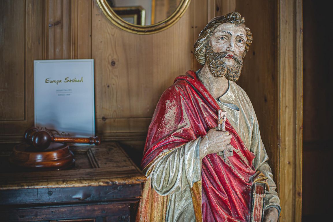 Zu den Highlights zählen sicherlich die zahlreichen Gemälde, antiken Holzstatuen und Heiligenfiguren oder die Lüster und Leuchten des Hotels. Wer stöbert, findet so manche Besonderheit, wie etwa eine bemalte zweiflügelige Schiebetür mit Tiroler Adler (Pos. 118), oder eine Glockenspeise, die an die Olympischen Winterspiele 1976 erinnert (Pos. 405).