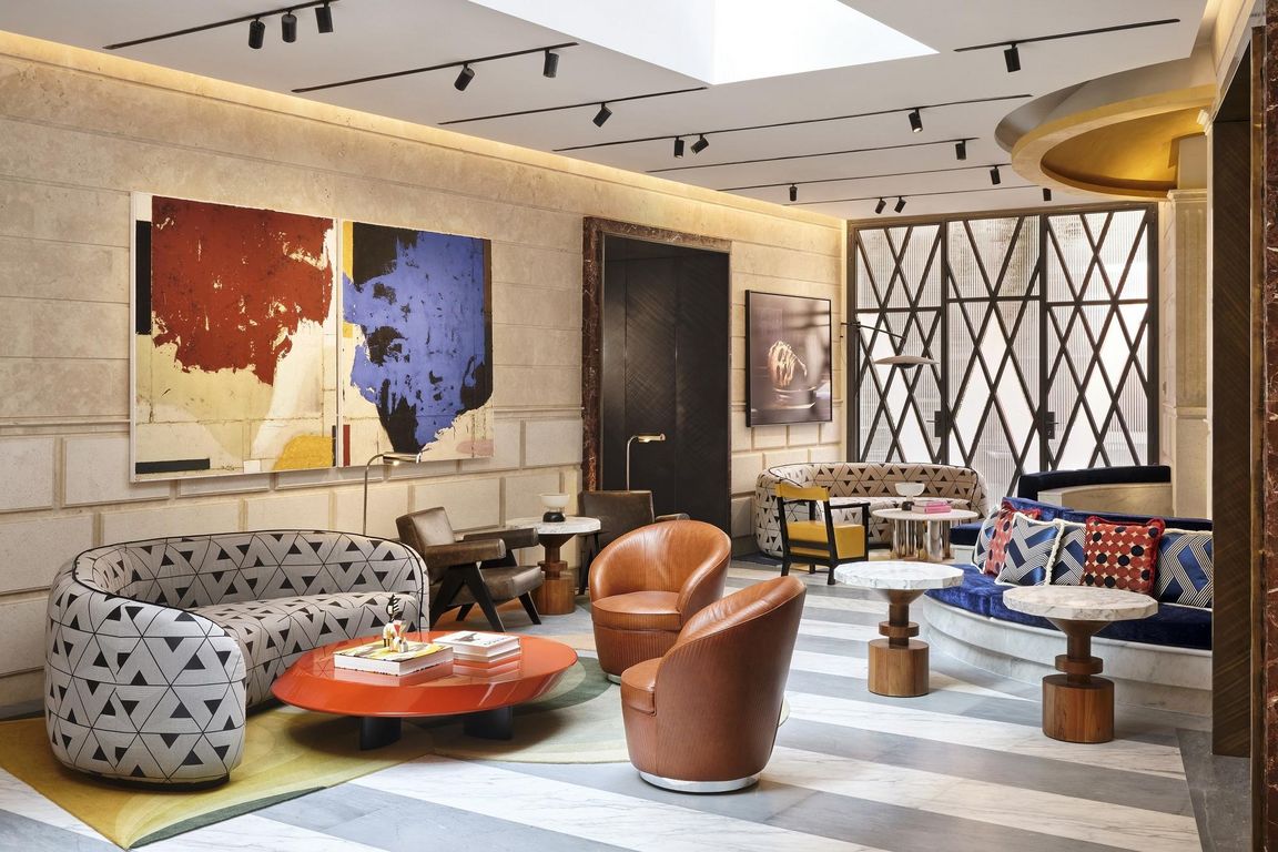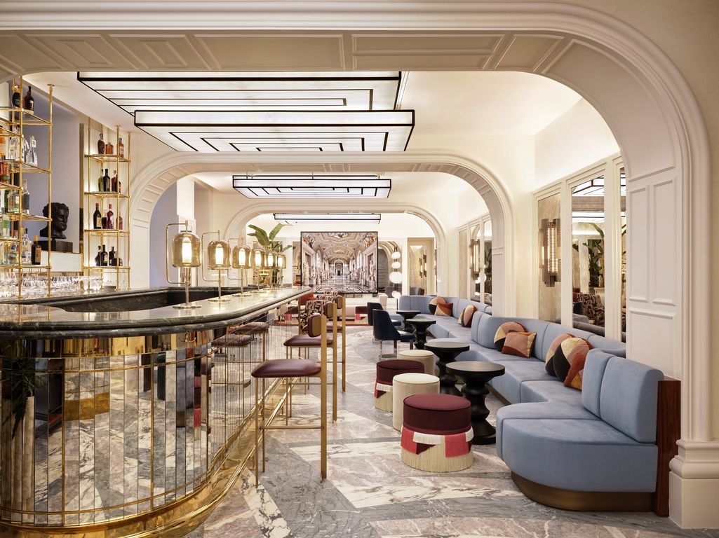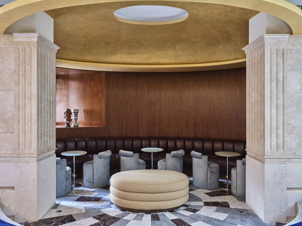 Das von Meyer Davis entworfene Hotel verbindet die traditionelle Architektur und das kulturelle Erbe der Stadt mit einer Interpretation des römischen Designs. Ein Mix aus farbenfrohen Ledermöbeln trifft auf Steinwände, die die Vergangenheit des Gebäudes widerspiegeln, während reflektierende Oberflächen einen modernen, zeitgenössischen Touch hinzufügen. Die Grenzen zwischen öffentlichen und privaten Räumlichkeiten sind fließend und überall gibt es Überraschungen für Gäste zu entdecken – darunter eine versteckte Tür im öffentlichen Bad, die zum intimen Parlapiano führt, einem geheimen Garten, der inspiriert von einer der Kirchen Borrominis aus traditionellem italienischem Stein besteht, mit romantischen Bänken, üppigem Blattwerk, Formschnitt und Wasserfontänen.