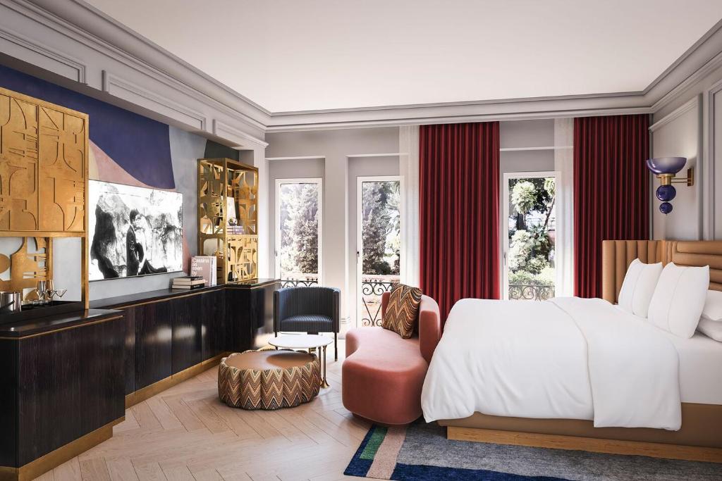 Viele der 147 Gästezimmer und 15 Suiten verfügen über einen eigenen Balkon oder eine Terrasse mit Blick auf die Stadt und Wahrzeichen wie das Istituto Svizzero und vermitteln Gästen das Gefühl in ihrem eigenen Stadtapartment zu sein. Die Zimmer umfassen einen offenen Wohnbereich mit raumhohen Fenstern, die in weinrote Samtvorhänge gehüllt sind, und Holzböden mit Fischgrätenmuster, die in die Marmorbäder übergehen. Die Extreme WOW (Präsidenten-) Suite bietet eine weitläufige Terrasse, die Wohnen im Innen- und Außenbereich ermöglicht. Bei der Einrichtung der Suite wurden historische römische Architekturelemente mit Technologie im Zimmer und modernen Möbeln kombiniert.
