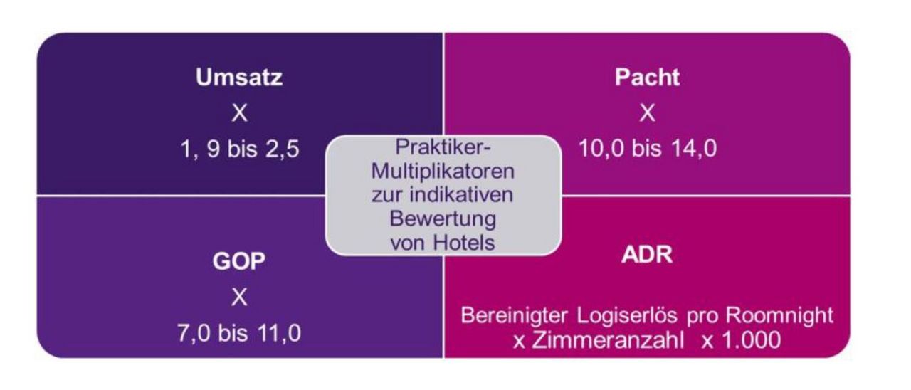 - Richtiger Bewertungs-Zugang: Zumeist, aber nicht immer, ist der Ertragswert der richtige Bewertungs-Zugang. Vor allem in 1A-Gunstlagen in Top-Destinationen wurden zuletzt deutlich höhere Preise bei Transaktionen erzielt. Zentrale Frage dabei ist zumeist, ob es alternative Nutzungs-Optionen für das Hotel gibt oder nicht.