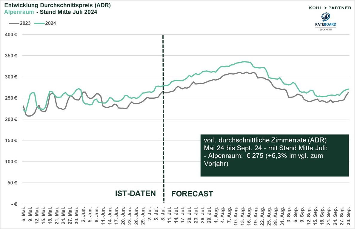 m Sommer 2024 zeigt sich in der bisherigen Entwicklung der durchschnittlichen Zimmerraten eine Steigerung der Preisdurchsetzung um durchschnittlich 6,3 Prozent gegenüber dem Vorjahr. Besonders mutig agierten die Hoteliers im Mai: Rund um die Ferientage und Pfingstferien konnte eine markante Steigerung der Zimmerraten um sieben Prozent im Vergleich zum Vorjahr erreicht werden. Im Juni ist eine leichte Steigerung der Preisdurchsetzung von 2,5 Prozent gegenüber dem Vorjahr feststellbar, wobei die Profitabilität der Hotellerie aufgrund des Nachfrageeinbruchs verstärkt zurückgegangen ist. In den Hochsaisonmonaten Juli und August sowie im September ist eine durchschnittliche Zunahme der Preisdurchsetzung von guten sieben Prozent zu beobachten.