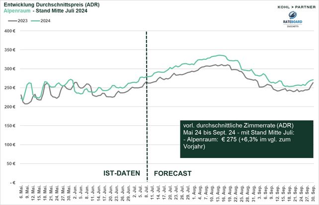 2. Deutliche Verbesserung der bisherigen Preisdurchsetzung im gesamten Alpenraum: Im vorläufigen Sommer 2024 zeigt sich eine deutliche Verbesserung der Preisdurchsetzung im Vergleich zum Vorjahr, besonders rund um die Ferientage und Pfingstferien im Mai. Im Juni war eine leichte Erhöhung der Preise bei rückläufiger Auslastung feststellbar. Der Forecast für die Ferienmonate und den Herbst deutet auf einen soliden bis guten Anstieg der Zimmerraten hin.