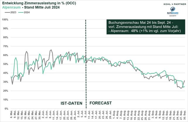 Im Juni machte sich die instabile Wetterlage sowie das Fehlen der Pfingstferien und des Feiertags Fronleichnam im Alpenraum bemerkbar, was zu einer Auslastung von 54 Prozent führte, knapp drei Prozent unter dem Vorjahresniveau. Die Buchungsvorschau für Juli zeigt ein ähnliches Niveau wie im Vorjahr, mit einer minimalen Veränderung von minus 0,5 Prozent. Der Forecast für August deutet auf ein Plus von zwei Prozent hin, während im September ein Zuwachs von drei Prozent erwartet wird.