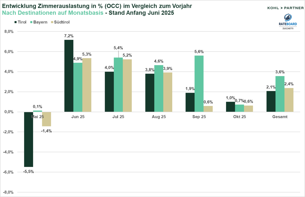 • Forecast September und Oktober: Im September zeigen Tirol und Südtirol leichte Zuwächse, während die größte Steigerung von 5,6% in Bayern erwartet wird. Im Oktober bleibt die Prognose nahezu stabil im Vergleich zum Vorjahr, mit nur minimalen Schwankungen
