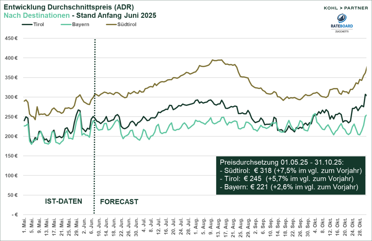Im Vergleich zur Nachfrageentwicklung zeigen sich deutliche Unterschiede in der Preisdurchsetzung zwischen den Destinationen: Südtirol führt mit einem durchschnittlichen ADR von 318 € (+7,5%) das Ranking an und weist die höchste Preissteigerung auf.