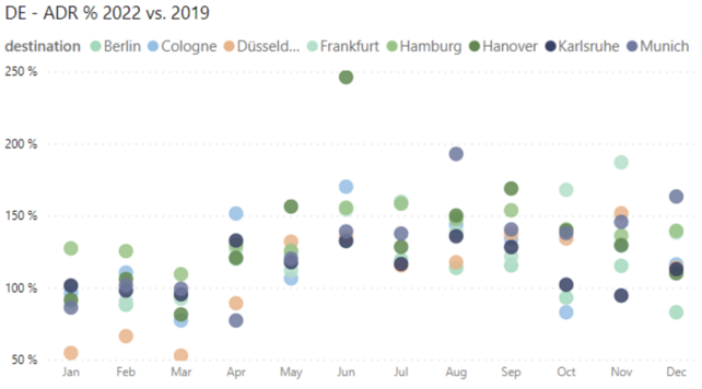HotelPartner stellt eindeutig fest, dass sich in diesem Jahr die Änderung des Reiseverhaltens in den Durchschnittsraten nach Monat im Vergleich zu 2019 wieder spiegelt.
