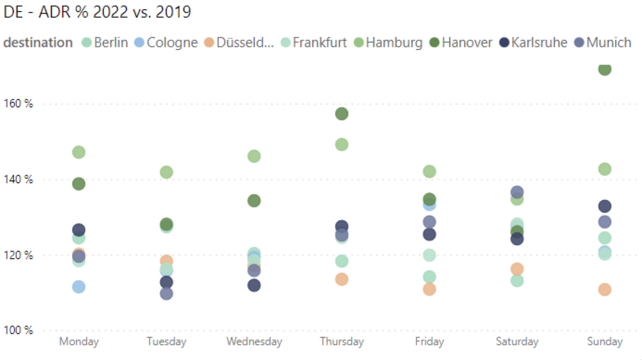 Jeder, der diesen Sommer im Urlaub war, hat die Kostenwelle am eigenen Leib gespürt. Im DACH-Raum sind auch die Preise im allgemeinen Konsum beachtlich gestiegen. Wenn man dann noch die übermäßig steigenden Kosten in der Hotellerie beachtet, ist ein Urlaub gleich deutlich teurer geworden. Hinzu kommen zwar bereits gesunkene, aber weiterhin bestehende Unsicherheiten hinsichtlich der Pandemiesituation, prekärer politischer Situationen etc., die bei vielen Gästen die Reisebereitschaft einschränken. Auch eine signifikante Veränderung hinsichtlich der Reisegewohnheiten konnte beobachtet werden, beispielsweise bei der Aufteilung der ADR auf Wochentage und Monate.