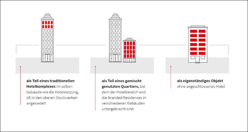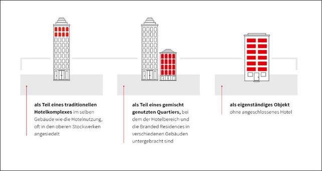 Apartments in Branded Residences können aus Eigentumswohnungen im Sondereigentum einzelner Käufer bestehen. Wie bei einer normalen Eigentumswohnung auch ist es für die Eigentümer möglich, die Apartments wahlweise selbst zu nutzen, sie zu vermieten oder auch temporär bei eigener Abwesenheit weiteren Nutzern wie Hotelgästen anzubieten. Dieser Vermietungs-Service kann zum Beispiel über das Hotel erfolgen. Darüber hinaus kann der Eigentümer alle Services des Hotels seinen jeweiligen Mietern zur Verfügung stellen.