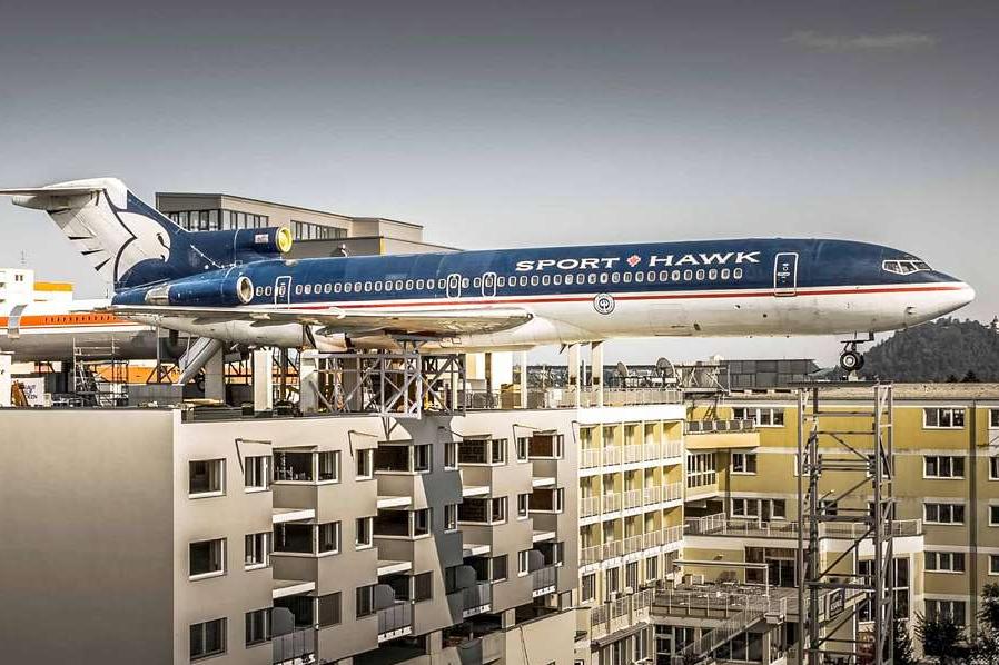 Das Novapark Hotel in Graz sorgte im April für reichlich Schlagzeilen, als auf dem Dach des Hotels ein ausgemustertes Flugzeug aufgestellt wurde. Kaum war diese logistische Meisterleistung vollbracht, folgte schon der nächste Flieger.