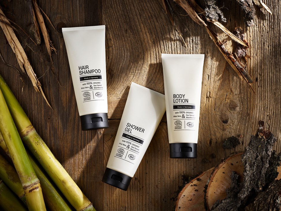 Hapag Lloyd Cruises stellt seinen Gästen Shower Gel, Hair Shampoo und Body Lotion in den 200ml Tuben zur Verfügung. Die nach dem internationalen Cosmos-Organic-Standard zertifizierte* Bio-Kosmetik mit Aloe Vera und Meerfenchel überzeugt mit einer anspruchsvollen maritimen Duftkomposition leicht salziger, ozoniger sowie aquatischer Komponenten. Die umweltschonende PICEA™ wood tube mit ihrer besonderen Oberflächenstruktur unterstreicht perfekt die Natürlichkeit des Produktes.