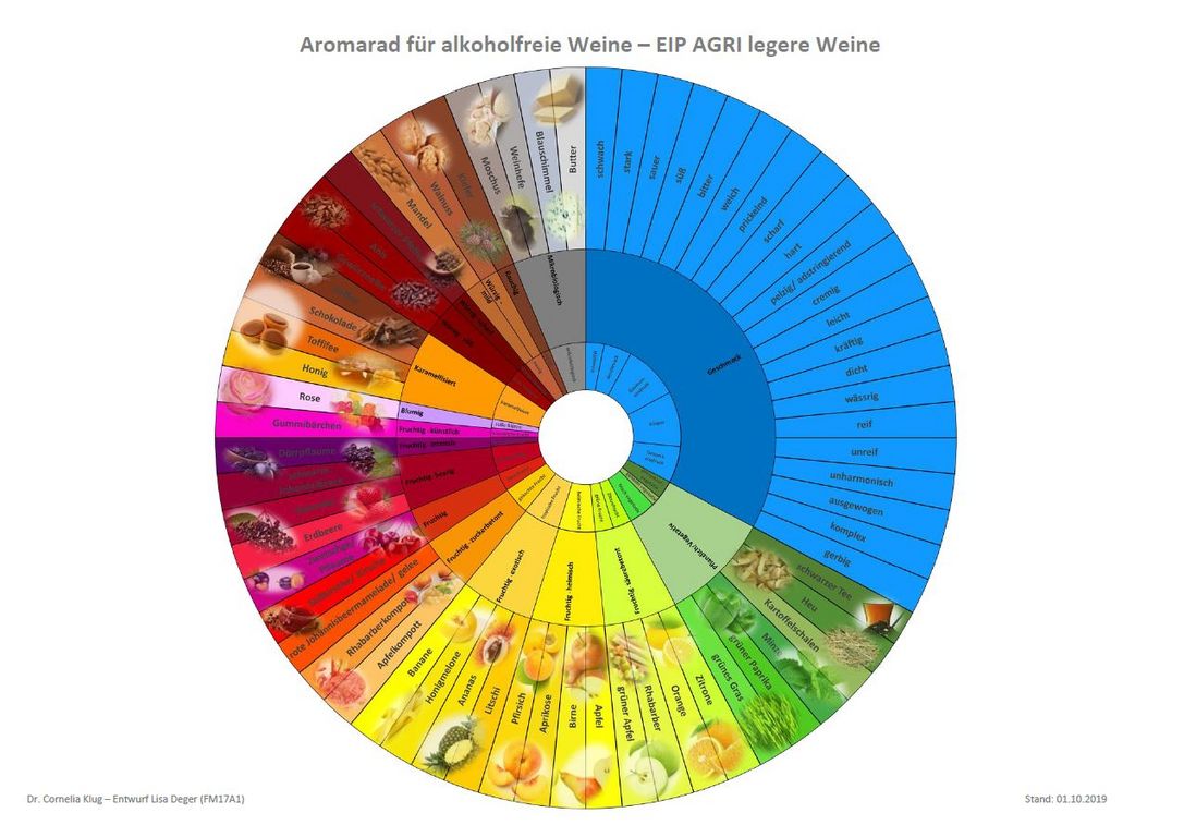 Probiert haben sie und ihre eigens für dieses Projekt geschulten 30 Sensorikexperten 25 am Markt erhältliche, alkoholfreie Weine. „Wir haben schnell festgestellt, dass wir zur objektiven Beschreibung der Aromen alkoholfreier Weine mit dem klassischen Weinaromenrad nicht weit kommen“, so Klug. Das Weinaromenrad ist ein vom Deutschen Weininstitut für Verbraucher entwickeltes Hilfsmittel zur sensorischen Beschreibung von Aromen, aber eben für alkoholhaltige Weine. Für alkoholfreie Weine gibt es bislang noch keines. Klug und ihr Team haben daher kurzerhand selbst eines entwickelt.