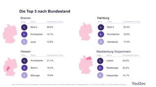 Beim Blick auf die vereinzelten Bundesländer fällt auf, dass die jeweilig vor Ort gebrauten Biermarken häufiger die Spitze ausmachen, wie beispielsweise in Bremen: Knapp zwei von fünf (39,6 Prozent) Bremern berücksichtigen beim Kauf die Marke Beck’s. Für Bitburger gelten im Saarland (37,8 Prozent) und in Rheinland-Pfalz (33,7 Prozent) ähnlich hohe Spitzenpositionen. Das badische Bier Rothaus Tannenzäpfle erreicht in Baden-Württemberg wiederum mit 25,8 Prozent Platz 1.