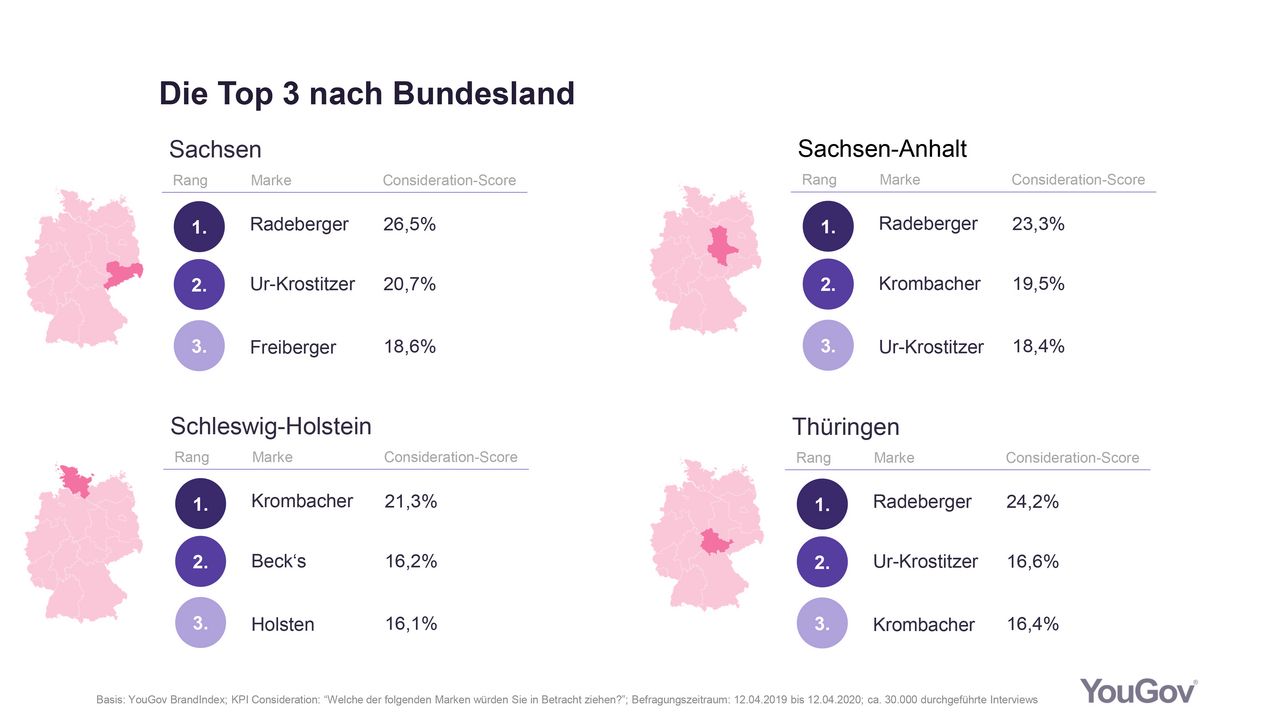 In den neuen Bundesländern ist die Biermarke Radeberger häufig an vorderster Stelle bei der Kaufberücksichtigung der Befragten: Die Sachsen-Anhalter ziehen mit 23,3 Prozent Radeberger in Erwägung, mit 19,5 Prozent Krombacher und mit 18,4 Prozent das Bier Ur-Krostitzer. In Sachsen entscheidet man sich beim Kauf am häufigsten neben Radeberger (26,5 Prozent) für Ur-Krostitzer (20,7 Prozent) und Freiberger (18,6 Prozent). In Mecklenburg-Vorpommern wiederum belegen Lübzer (24 Prozent), Radeberger (20,2 Prozent) und Hasseröder (14,1 Prozent) die vordersten drei Plätze.