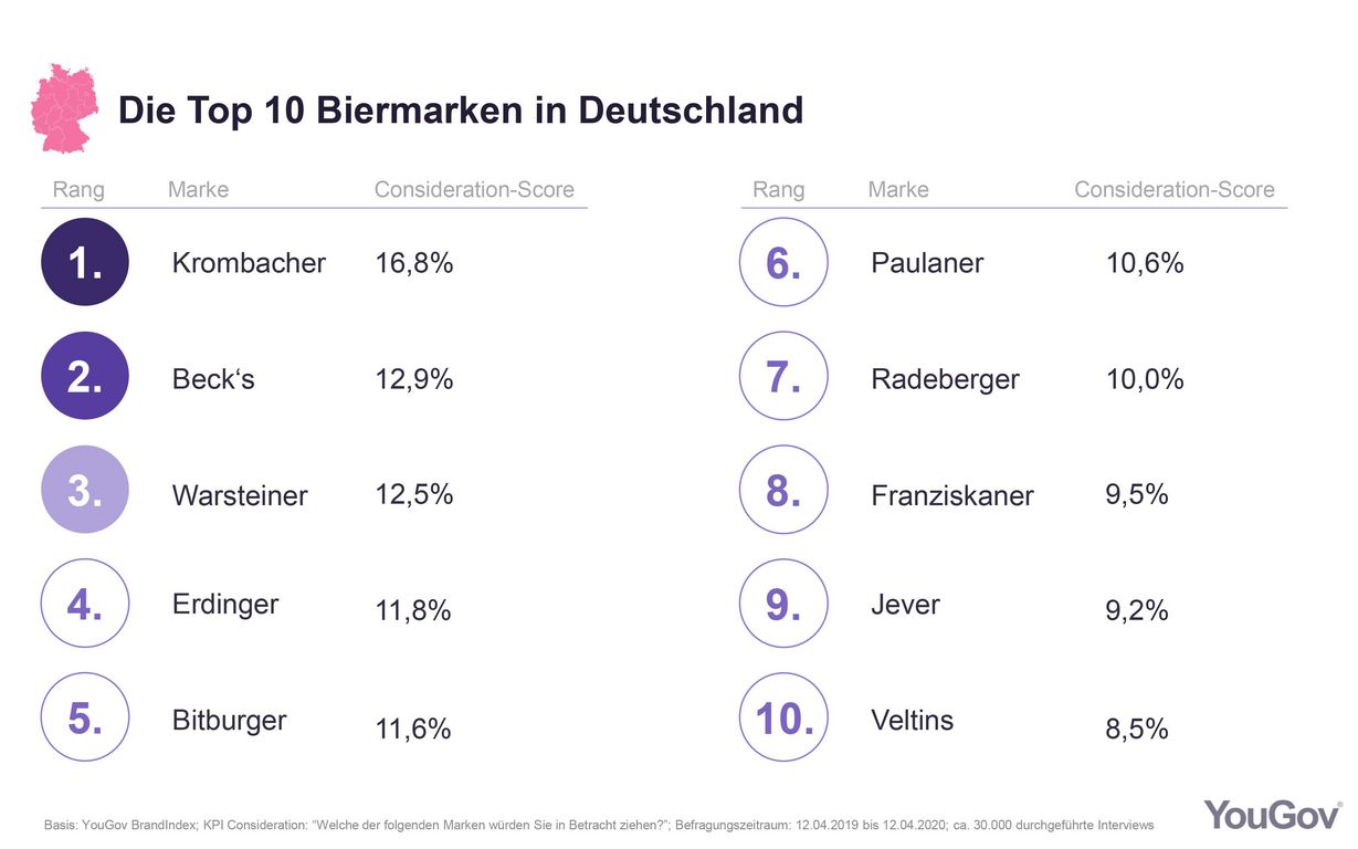 Deutschland ist eine der größten Braunationen der Welt. Zum Tag des Deutschen Bieres am 23. April zeigt ein aktuelles Ranking, welche der im YouGov BrandIndex getrackten Biermarken innerhalb des letzten Jahres am ehesten von den Deutschen beim Kauf in Betracht gezogen wurden. Mit 16,8 Prozentpunkten landet Krombacher dabei auf Platz 1, die Marke Beck’s mit 12,9 Prozent auf Platz 2 und Warsteiner mit 12,5 Prozent auf Platz 3. Erdinger kann sich mit 11,8 Prozent den vierten Platz sichern. Bitburger landet mit 11,6 Prozentpunkten auf Platz 5. Die Prozentwerte geben an, wie viele der Befragten die jeweilige Biermarke in Betracht ziehen würden.