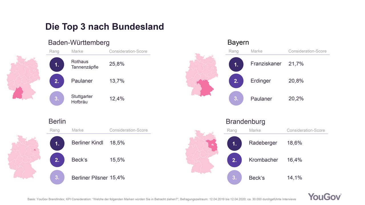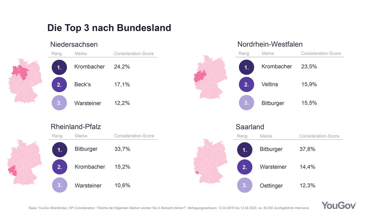 Die Top 3-Marken der Bundesländer haben zum größten Teil ihren Ursprung in den jeweiligen Regionen. Demnach ergibt sich beispielsweise in Bayern die folgende Reihenfolge: Franziskaner (21,7 Prozent) auf Platz 1, Erdinger (20,8 Prozent) auf Platz 2 und Paulaner (20,2 Prozent) auf Platz 3. In Berlin zeigt sich folgendes Bild: Berliner Kindl (18,5 Prozent) auf Platz 1, Beck’s (15,5 Prozent) auf Platz 2 und Berliner Pilsner (15,4 Prozent) auf Platz 3. Die Bewohner von Nordrhein-Westfalen wählen Krombacher mit 23,5 Prozent auf Platz 1, Veltins mit 15,9 Prozent auf Platz 2 und Bitburger mit 15,5 Prozent auf Platz 3.