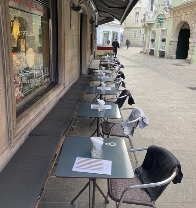 Beheizbare Auflagen auf den Bänken vor dem Café Frankowitsch sorgen für angenehme Wärme an kühlen Tagen. Foto: Frankowitsch / Peter Weinhofer