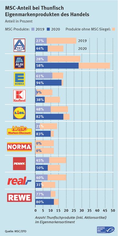 Acht der zehn größten deutschen Supermärkte und Discounter haben heute einen höheren Anteil nachhaltiger, MSC-zertifizierter Ware in ihrem Thunfischsortiment als noch vor einem Jahr. Den größten Sprung hat Netto gemacht: Der Discounter hat seinen Anteil nachhaltiger Thunfischprodukte innerhalb eines Jahres vervierfacht. Bei den Supermärkten hat derzeit das Thunfischsortiment von EDEKA die Nase vorn, bei den Discountern hat Lidl das nachhaltigste Thunfischangebot.