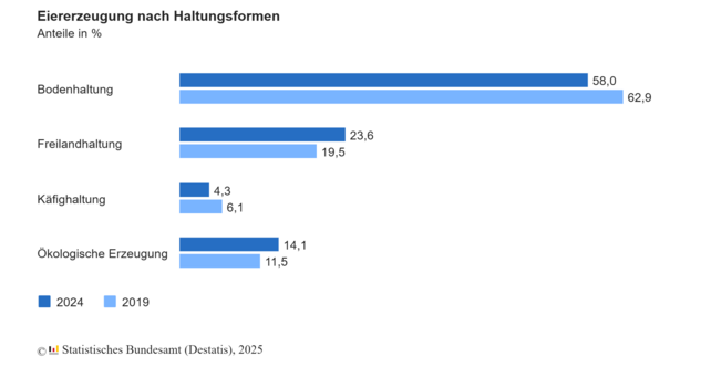 Im Fünfjahresvergleich zum Jahr 2019 wird der rückläufige Trend der Bodenhaltung noch deutlicher: Damals stammten noch 62,9 Prozent der in Deutschland produzierten Eier aus Bodenhaltung. Demgegenüber stieg der Anteil der Eier aus Freilandhaltung im Jahr 2024 weiter auf 23,6 Prozent (2023: 23,0 Prozent; 2019: 19,5 Prozent). Der Anteil der Eier aus ökologischer Erzeugung lag bei 14,1 Prozent und stieg damit ebenfalls gegenüber dem Vorjahr (2023: 13,4 Prozent; 2019: 11,5 Prozent). Der verbleibende Anteil von 4,3 Prozent der Eierproduktion entfiel auf die Haltung in Kleingruppen und ausgestalteten Käfigen (2023: 4,9 Prozent; 2019: 6,1 Prozent).