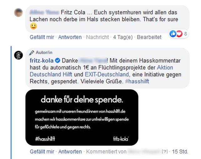 Da Unternehmen selbst den diskriminierenden Äußerungen von Nutzern innerhalb der sozialen Medien kaum etwas entgegensetzen können, wandelt fritz-kola den Hass kurzerhand in Gutes um. Über die Initiative „HASS HILFT“ spendet die Getränkemarke für jeden Hasskommentar unter den betroffenen Facebook Posts einen Euro für Flüchtlingsprojekte der „Aktion Deutschland Hilft“ sowie „EXIT-Deutschland“, einer Initiative gegen Rechts.