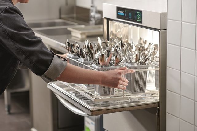 Zunächst wird gespült. Dabei sorgen Wasser und ein spezieller Besteckreiniger dafür, dass die Verschmutzungen effektiv gelöst werden. Bei Edelstahl kommt der hochkonzentrierte Flüssigreiniger F 420 e zum Einsatz. Für Silber wird der materialschonende Reiniger F 720 BLUe empfohlen. Durch die senkrechte Position in den Köchern des Korbes wird das Besteck von allen Seiten umspült. Drahtgitterkörbe werden in verschiedenen Größen und je nach Variante mit bis zu neun Köchern angeboten. Damit lassen sich bis zu 120 Besteckteile in einem Spülgang reinigen. Der hohe Wasserdruck unterstützt den Reinigungsprozess, hält das Besteck in leichter Bewegung und verhindert in Kombination mit der innovativen Düsengeometrie, dass Sprühschatten entstehen. Bei der Nachspülung sorgt der Klarspüler zunächst dafür, dass der Wasserfilm sauber abläuft. Für die Nachspülung ist das richtig aufbereitete Wasser entscheidend. Winterhalter empfiehlt hier Osmosegeräte, die dem Wasser bis zu 98 Prozent aller Salze und Mineralien entziehen, damit bleiben keine Flecken auf dem Besteck zurück. Die Geräte gibt es als externe Varianten oder platzsparend eingebaut in der Untertischspülmaschine. Durch die hohe Wassertemperatur hat das Besteck so viel Wärmeenergie aufgenommen, dass auch die letzten Wasserreste rückstandsfrei abtrocknen. So kommt am Ende das Besteck erstklassig gespült und brillant glänzend aus der Maschine.