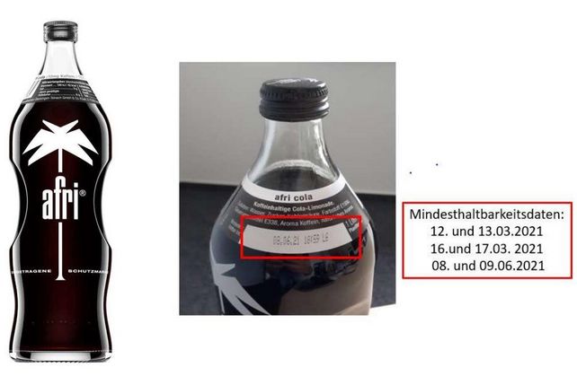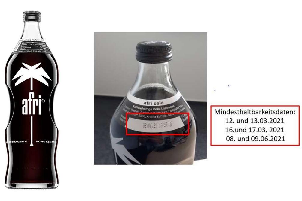 Niehoffs Vaihinger Fruchtsaft GmbH ruft afri Cola 10 mg Coffein und afri Cola ohne Zucker in der 1 l Glasflasche mit den Mindesthaltbarkeitsdaten 12.03.2021 und 13.03. 2021,16.03.2021 und 17.03.2021 sowie 08.06.2021 und 09.06.2021 wegen der Gefahr eines möglichen Glasbruchs zurück. Laut Flaschenhersteller weisen Flaschen mit den oben genannten Mindesthaltbarkeitsdaten eine Instabilität auf, die zu einer Rissbildung, schlimmstenfalls zu einem Zerbersten der Flasche führen könnte. Das Getränk selbst ist einwandfrei.