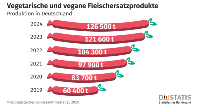 Die Produktion von vegetarischen oder veganen Fleischalternativen ist im vergangenen Jahr weiter gewachsen – wenn auch weniger dynamisch als noch in den Jahren zuvor. Im Jahr 2024 wurden hierzulande 126.500 Tonnen Fleischersatzprodukte produziert, 4,0 Prozent mehr als 2023 mit 121.600 Tonnen. Der Wert dieser Produkte stieg mit 647,1 Millionen Euro im Jahr 2024 um 10,9 Prozent gegenüber dem Vorjahr (583,2 Millionen Euro). Im Fünf-Jahresvergleich hat sich die Produktion mehr als verdoppelt (+109,5 Prozent): 2019 wurden 60.400 Tonnen Fleischersatzprodukte hergestellt.