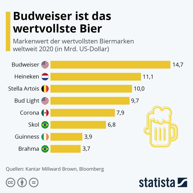 Die US-amerikanische Biermarke Budweiser ist die wertvollste weltweit, vor Heineken aus den Niederlanden und dem belgischen Stella Artois. Laut BrandZ Top 100 Most Valuable Global Brands 2020 wird Budweisers Markenwert mit 14,7 Milliarden US-Dollar bemessen – 3,6 Milliarden mehr als der des zweitplatzierten Heineken, wie die Statista-Grafik zeigt.