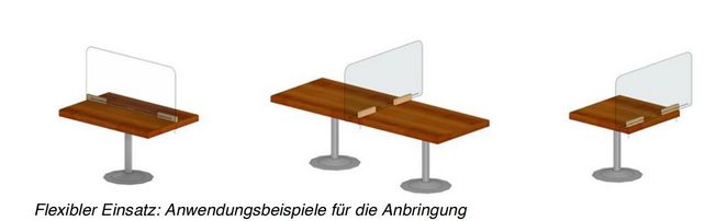 Durch die flexible Schraub-Klemm-Fixierung ist kein bohren o.ä. notwendig – es bleiben keine Rückstände an Tisch und Theke. Die Arcylscheiben werden in zahlreichen Größen angeboten, so dass Sie individuell auf Ihre Tischgrößen zzgl. gewünschten Überstand (zum Schutz des Sitznachbarn, auch bei Bänken möglich) wählen können, um den optimalen Schutz zu bieten.