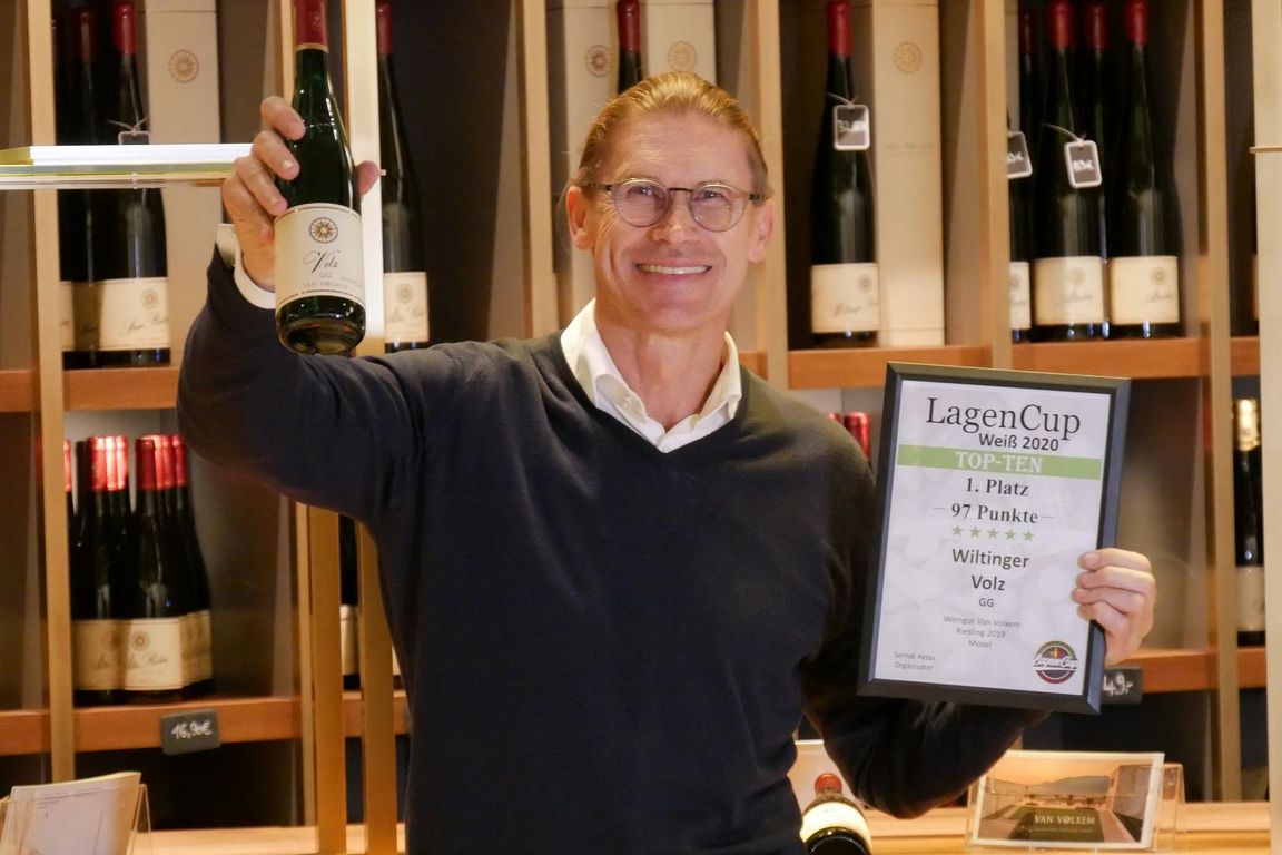 Mit dem 2019er Riesling „Volz GG“ hat das Weingut Van Volxem an der Saar den „Lagen-Cup Weiß 2020“ gewonnen. Winzer Roman Niewodniczański freute sich über die erreichten 97 von 100 möglichen Punkten.