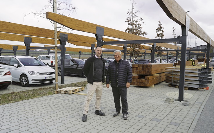 Aktuell sind auf dem Firmengelände ungefähr 8.000 Quadratmeter Dachfläche mit PV-Anlagen belegt. Diese erbringen eine Leistung von ca. 550 Kilowattstunden Peak. 90 Prozent der bisher erzeugten Energie, 2022 waren das 560 Tausend Kilowattstunden, kann Winterhalter für sich selbst nutzen. Vor allem am Wochenende wird der Überschuss ins Stromnetz eingespeist. Mit der neuen Parkplatzüberdachung kommen etwa 500 Kilowattstunden Peak hinzu. Damit werden in Zukunft etwas ein Viertel der gesamten Firmenfläche mit PV-Anlagen bedeckt sein. Graeff rechnet damit, dass mit der neuen Anlage etwa 40 Prozent des eigenen Strombedarfs gedeckt werden können.