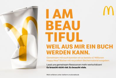 Mit dem Slogan "I AM BEAUTIFUL" macht McDonald's Deutschland seine Verpackungen zu den Stars der neuen "Better M"-Kampagne und ruft zur Wertschätzung von Ressourcen sowie zum Schließen von Wertstoffkreisläufen auf.
