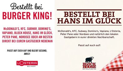 Ungewöhnliche Zeiten sorgen für ungewöhnliche Kooperationen: Nachdem Anfang des Monats bereits Burger King in Großbritannien und Frankreich für eine Bestellung bei der Konkurrenz warb, zogen in der Folge immer mehr deutsche Unternehmen nach.