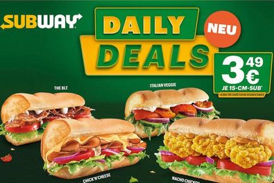Subway setzt auf eine neue Preiskampagne, um die Zielgruppe der 14- bis 29-Jährigen anzusprechen. Die „Daily Deals“ bieten vier verschiedene 15 Zentimeter lange Subs zu einem Preis von 3,49 Euro an und sollen besonders preisbewusste junge Kunden in die Filialen locken.
