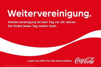 Die Deutsche Einheit jährt sich 2020 zum dreißigsten Mal. Anlässlich des Jubiläums ermutigt Coca‑Cola mit der neuen Kampagne "Weitervereinigung" dazu, die Wiedervereinigung jeden Tag aufs Neue zu leben.