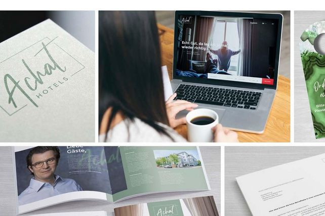 Achat Hotels zeigt sich deutlich im neuen Logo und Slogan, einer überarbeiteten Farbgebung und der emotionalen Bildsprache. Den Namen Achat, als Logo einst in starren Großbuchstaben geschrieben, ersetzt jetzt eine dynamische Handschrift innerhalb eines rechteckigen Rahmens. Die Achat Hotels befinden sich derzeit in einer Expansionsphase und möchten sich mit der neuen Strategie stärker als Marke positionieren und einen höheren Wiedererkennungswert erzielen.