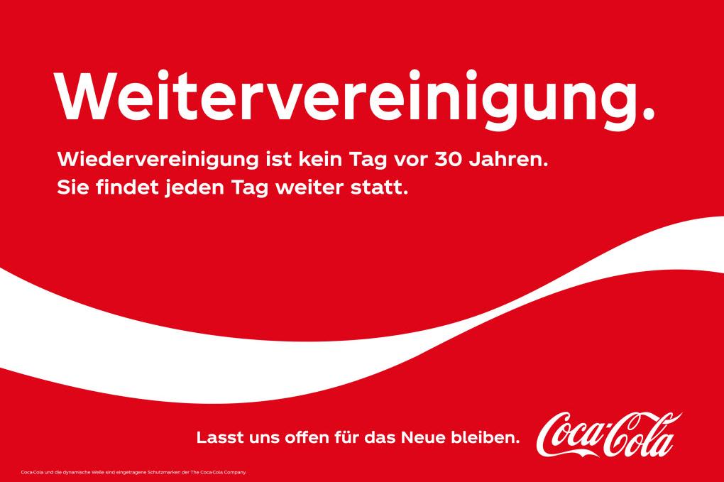 Anlässlich des Tags der Deutschen Einheit und im Rahmen der Kampagne „Offen wie nie zuvor“ ermutigt Coca-Cola die Menschen, weiter mit Offenheit und gegenseitiger Akzeptanz gestärkt in eine gemeinsame Zukunft zu gehen. Der Begriff „Wiedervereinigung“ wird dabei zur „Weitervereinigung“ und der Kerngedanke des Zusammenhalts in die Gegenwart und Zukunft getragen.