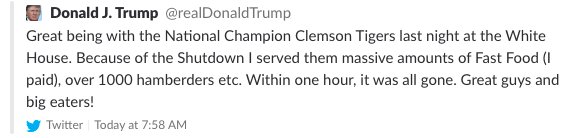 Anschließend twitterte Trump „Great being with the National Champion Clemson Tigers last night at the White House. Because of the Shutdown I served them massive amounts of Fast Food (I paid), over 1.000 hamberders etc. Within one hour, it was all gone. Great guys and big eaters!"