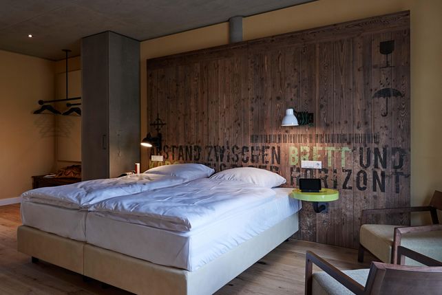 Oldtimer in der Lobby, dunkle Ledersessel, originale Industrielampen sowie viel Holz, Sichtbeton und Backstein: Im Hotel zieht sich Industriecharme durch alle Räumlichkeiten. Ein eigener Charakter und zahlreiche Möbelstücke mit Geschichte zeichnen das Designkonzept des Hauses aus. So hat der Hannoveraner Graffiti-Künstler Patrik Wolters alias BeNeR1 die Beschilderung im Hotel und auch das Garagentor in der Bar gestaltet.