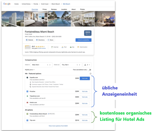 Ganz ohne Kosten läuft das Angebot von Google allerdings nicht. Hotels können dort nur erscheinen, wenn das Haus oder die Marke bereits Google Hotel Ads-Kampagnen schaltet und somit im bezahlten Bereich sichtbar ist. Nur dann besteht die Möglichkeit, zweimal sichtbar zu sein: im bezahlten „Feed“, sowie in einem organischen Listing. Der finanzielle Einsatz kann hier mit niedrigen Geboten allerdings im Cent-Bereich gehalten werden.