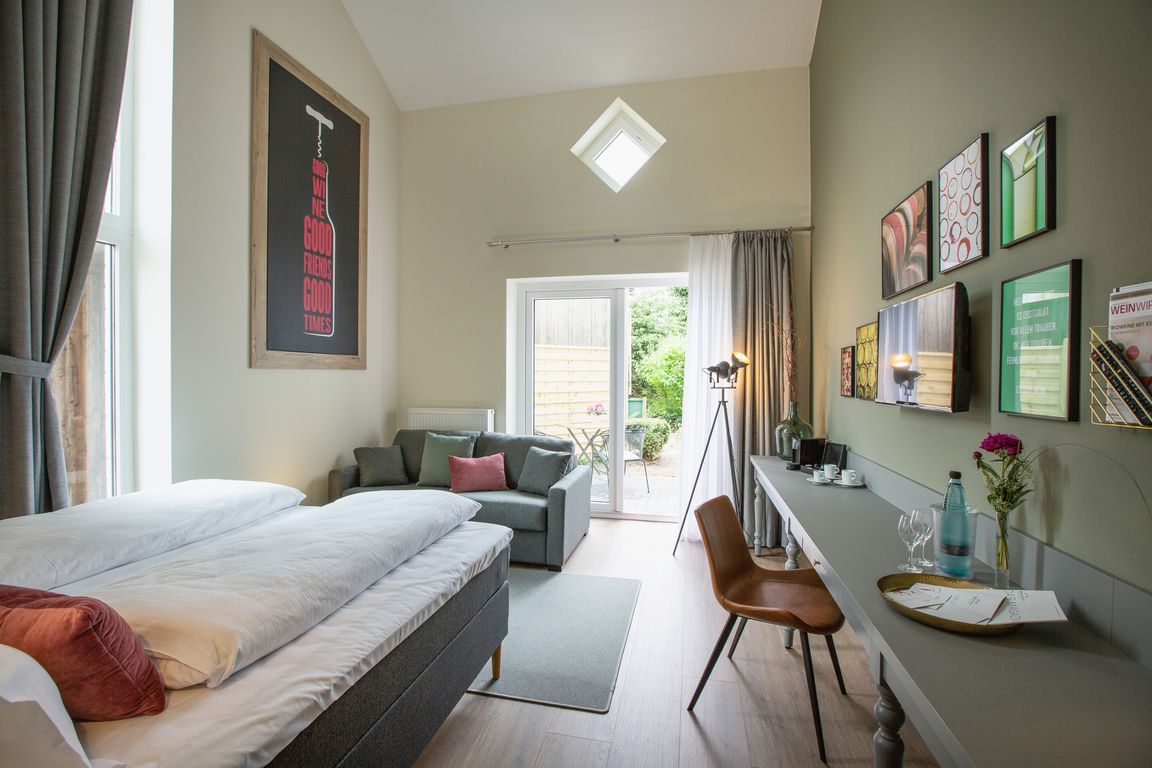 So ist das Weinbek ganz auf Wein eingestellt – angefangen von den Zimmernummern, die in Oechsle-Graden dargestellt werden bis hin zur Ausstattung, wie Weinflaschentische oder -vasen sowie ansehnliche Bilder mit besonderen Weinsprüchen. Die Zimmerkategorien werden nach der Qualitätspyramide des Verbands Deutscher Prädikatsweingüter e.V. (VDP) wie Gutswein, Ortswein oder Erste Lage benannt. Die Farbgestaltung im ganzen Hotel spiegelt die edlen Tropfen in all ihren Couleurs wider – dies reicht von dunkelrot bis graugrün. Eyecatcher ist zudem der cognacfarbene Kunstlederstuhl, der in jedem individuell gestalteten Zimmer seinen Platz hat, aber auch die großen gemütlichen Betten mit Eichenholzwand sowie einzelne Spiegel aus Weinfässern.