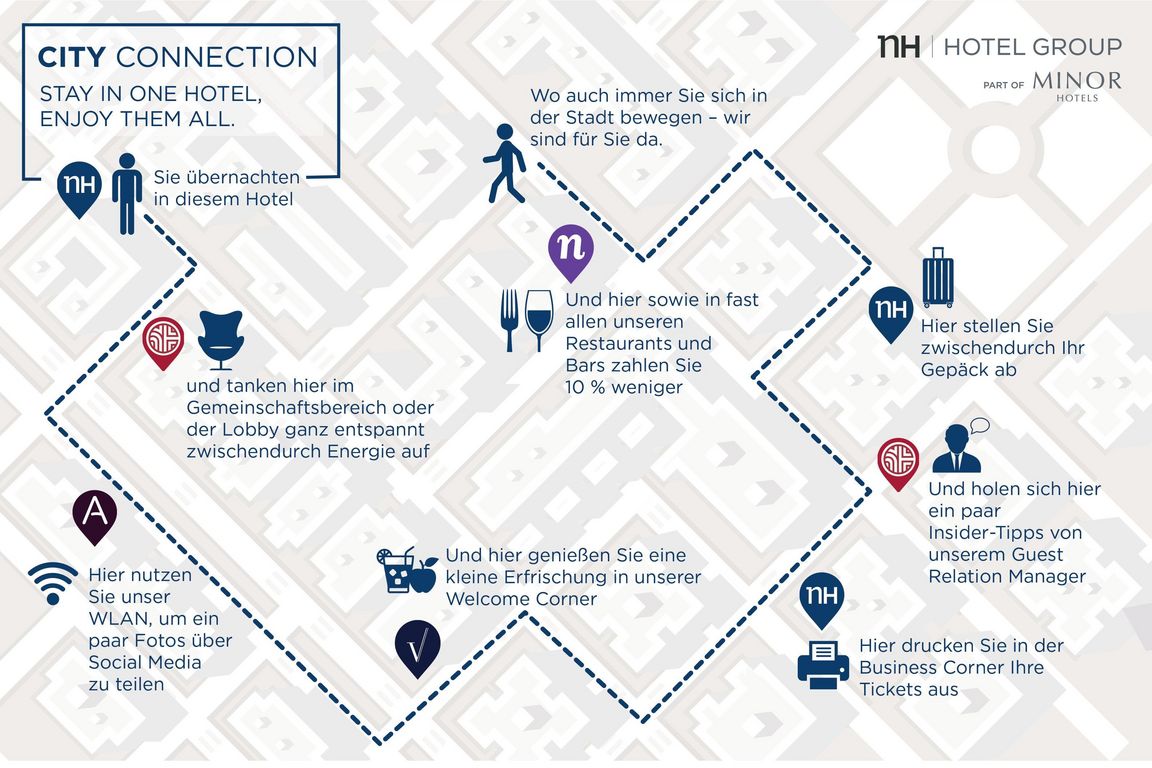 Anstatt auf die Angebote des gebuchten Hotels beschränkt zu sein, können die Gäste sämtliche der Standorte der NH Hotel Group in der jeweiligen Stadt für eine Auszeit, Veranstaltung oder andere Zwecke nutzen. Gäste erhalten beim Check-in einen City Connection Pass, mit dem sie das Serviceangebot wahrnehmen können. Der Pass enthält Informationen und Lagebeschreibungen zu den teilnehmenden Hotels der Gruppe sowie zur jeweiligen Gültigkeit des Angebots.