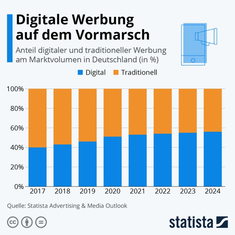In diesem Jahr wird der Anteil von digitaler Werbung in Deutschland am Gesamtumsatz der Werbebranche erstmals höher sein als der Anteil traditioneller Werbung. Laut Statista Advertising & Media Outlook betrage der Anteil der digitalen Werbung 51 Prozent und werde in den folgenden Jahren kontinuierlich um schätzungsweise 3,8 Prozent steigen.