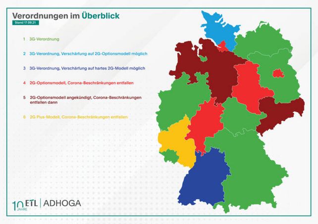 Um Gastronomen, Clubbesitzern, Veranstaltern und Gästen einen Überblick über die geltenden Maßnahmen in den einzelnen Bundesländern zu verschaffen, integriert ETL ADHOGA die jeweilige Beschlusslage in ihre exklusive und wöchentlich aktualisierte Infografik. Ob 2G, 2G Plus, 3G oder ein ganz anderes Modell – mit der frei verfügbaren Infografik von ETL ADHOGA bleibt der „Flickenteppich an Maßnahmen“ (ETL ADHOGA-Leiter Erich Nagl) übersichtlich.
