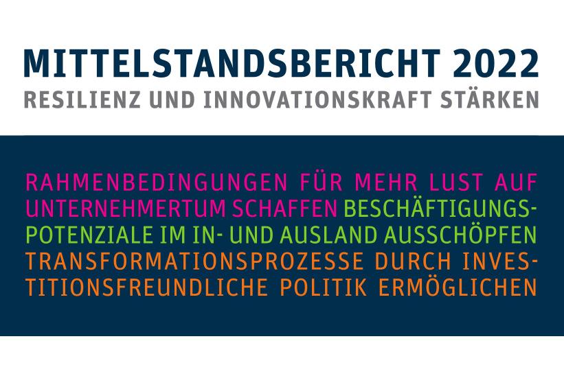 Der Mittelstandsbericht zeigt auf, worauf es jetzt ankommt, formuliert die Erwartungen der mittelständischen Wirtschaft und gibt konkrete Handlungsempfehlungen. Der Mittelstand bekennt sich trotz der aktuell schwierigen Lage klar zum Klimaschutz und zur Energiewende. Nachhaltigkeit und Innovation gehören seit jeher zur Identität des Mittelstands. Viele mittelständische Betriebe treiben den Transformationsprozess unseres Landes mit wichtigen Innovationen voran. Ohne die Mittelständler aller Größenklassen, Branchen und Regionen kann der Wandel zu einer klimaneutralen und digitalen Wirtschaft nicht gelingen.