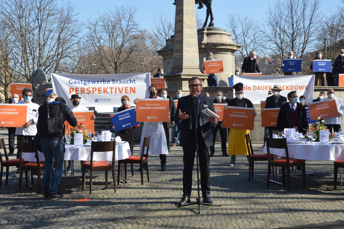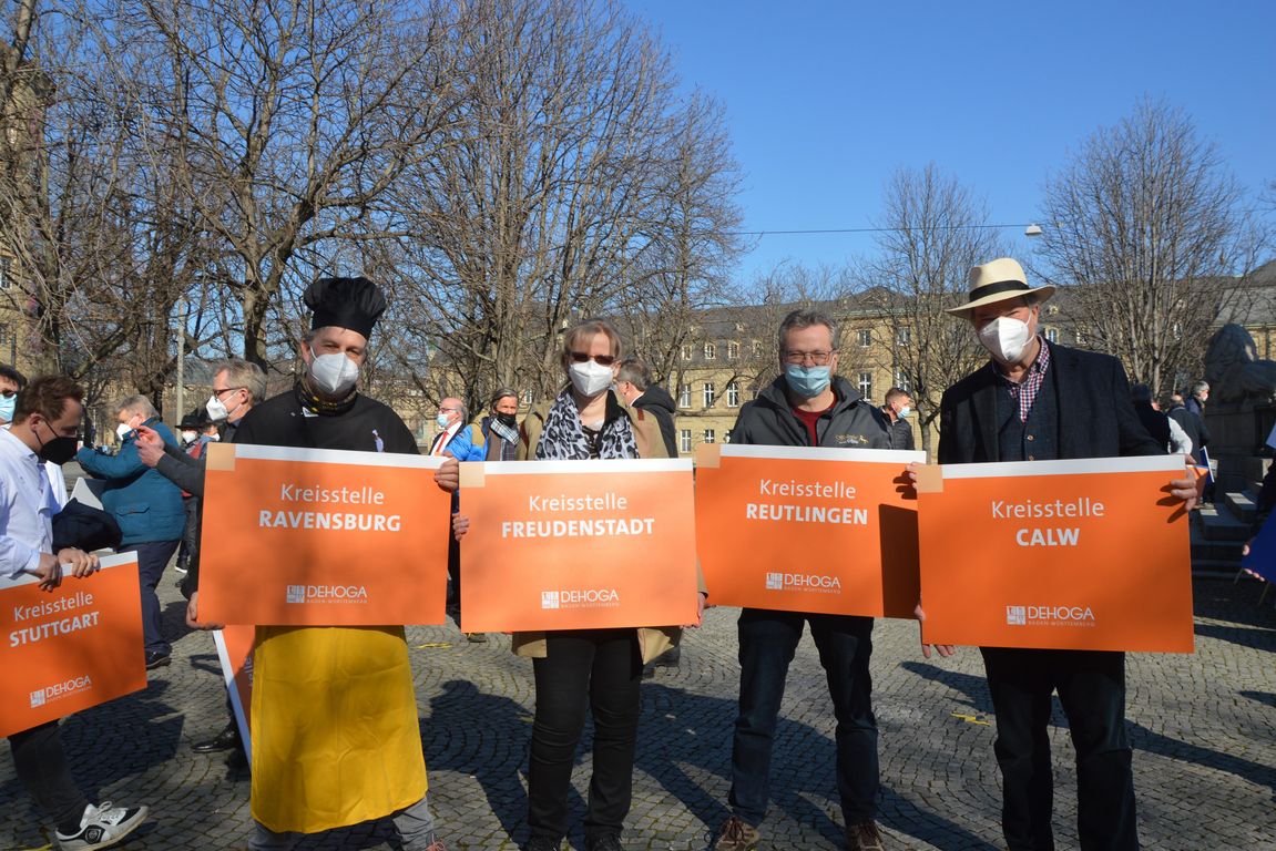 An der Kundgebung nahmen die Vorsitzenden zahlreicher DEHOGA-Kreisstellen aus allen Teilen Baden-Württembergs stellvertretend für ihre Kolleginnen und Kollegen im Land teil – insgesamt rund 50 Personen. Um optimalen Infektionsschutz gewährleisten zu können, hatte der Verband bewusst auf eine Veranstaltung mit mehr Teilnehmenden verzichtet, „obwohl es an Zuspruch sicher nicht gemangelt hätte“, wie DEHOGA-Landesvorsitzender Fritz Engelhardt erklärte.
