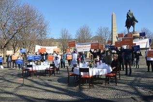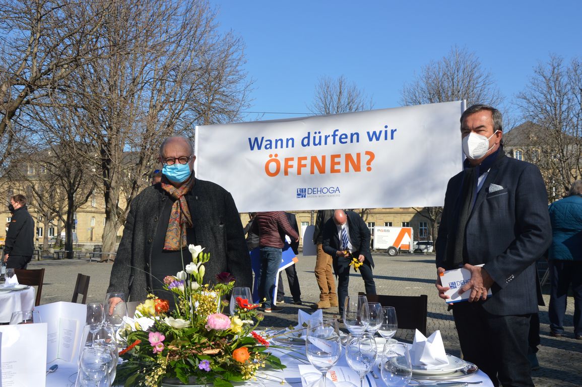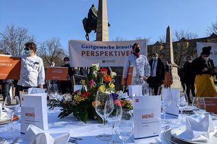 Auf die existenzbedrohliche Lage ihrer Branche haben Gastronomen und Hoteliers aus allen Teilen Baden-Württembergs bei einer Kundgebung des Hotel- und Gaststättenverbandes DEHOGA auf dem Stuttgarter Karlsplatz aufmerksam gemacht und Öffnungsperspektiven für ihre Betriebe gefordert. Mit eingedeckten, aber unbesetzten Restauranttischen verdeutlichten sie symbolisch die Notlage ihres Gewerbes im Corona-Lockdown.