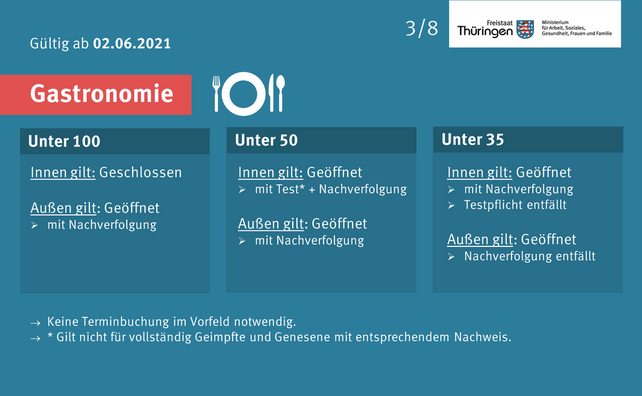 Außengastronomie bereits bei einer Inzidenz unter 100 öffnen. Ab jetzt gilt dies auch für die Innengastronomie bei einer Inzidenz von unter 50.